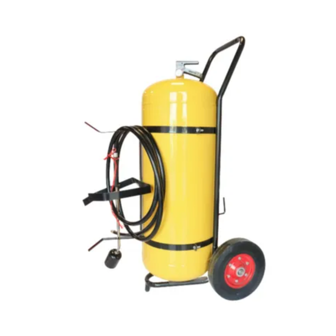 Equipo contra incendio de gran capacidad montado sobre ruedas, cargado con agente especial para combatir incendios en metales combustibles, diseñado para aplicaciones industriales de alto riesgo.